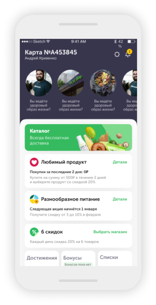 Главный экран приложения «Моя карта» содержит полезную для Пользователя информацию: персональные скидки, количество бонусов на счёте, спецпредложения.