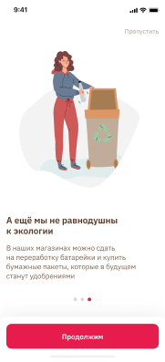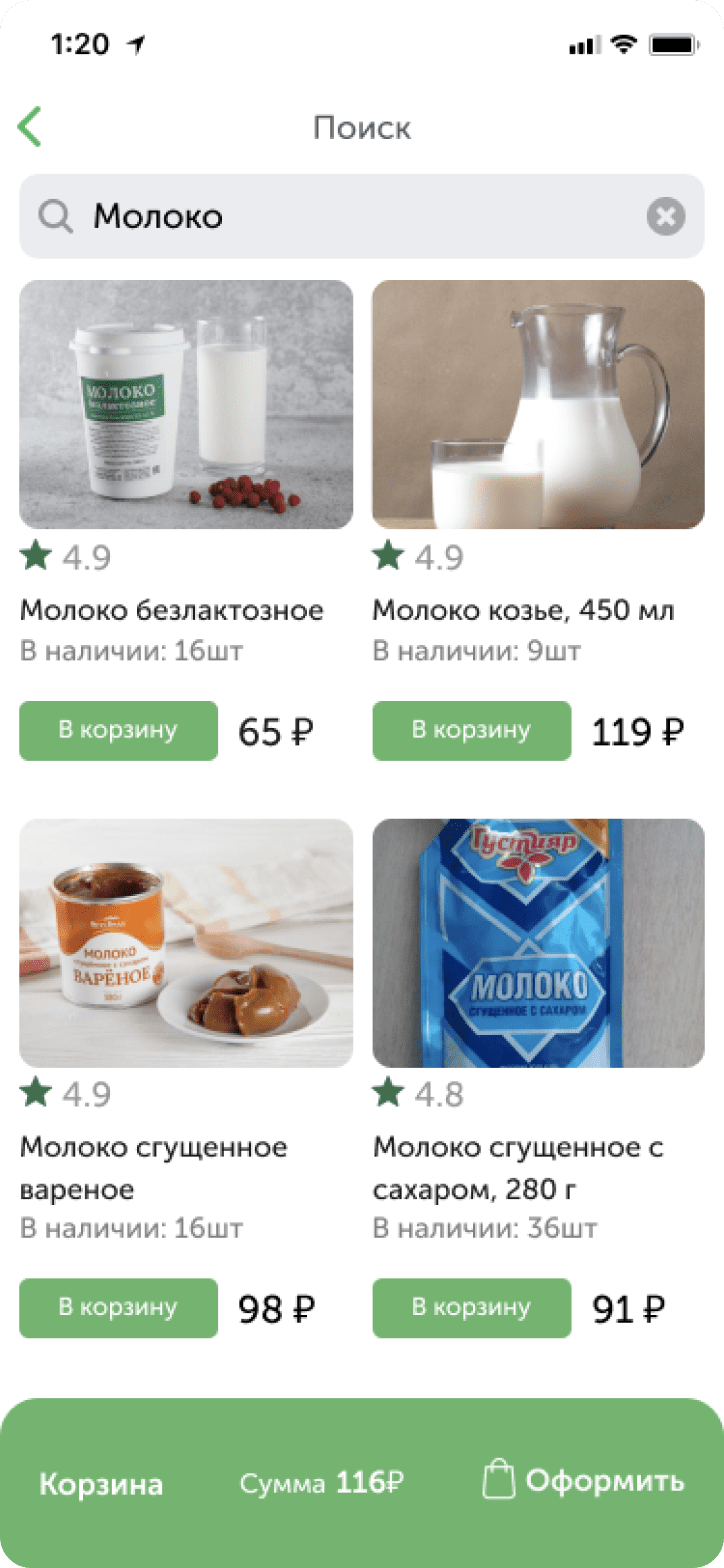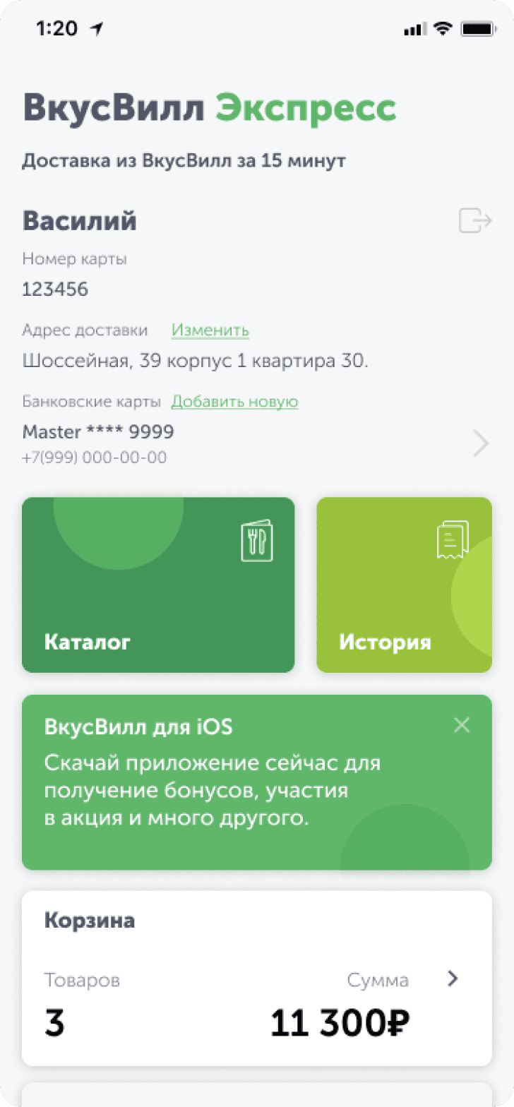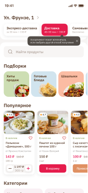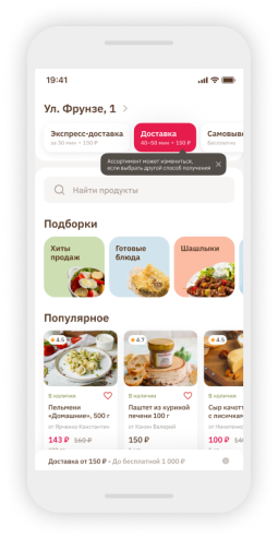 Указав адрес доставки, пользователь увидит ассортимент товаров в ближайших магазинах. С помощью поиска он находит необходимые продукты в каталоге, добавляет их в корзину. Закреплённый за пользователем QR-код даёт возможность накапливать баллы.