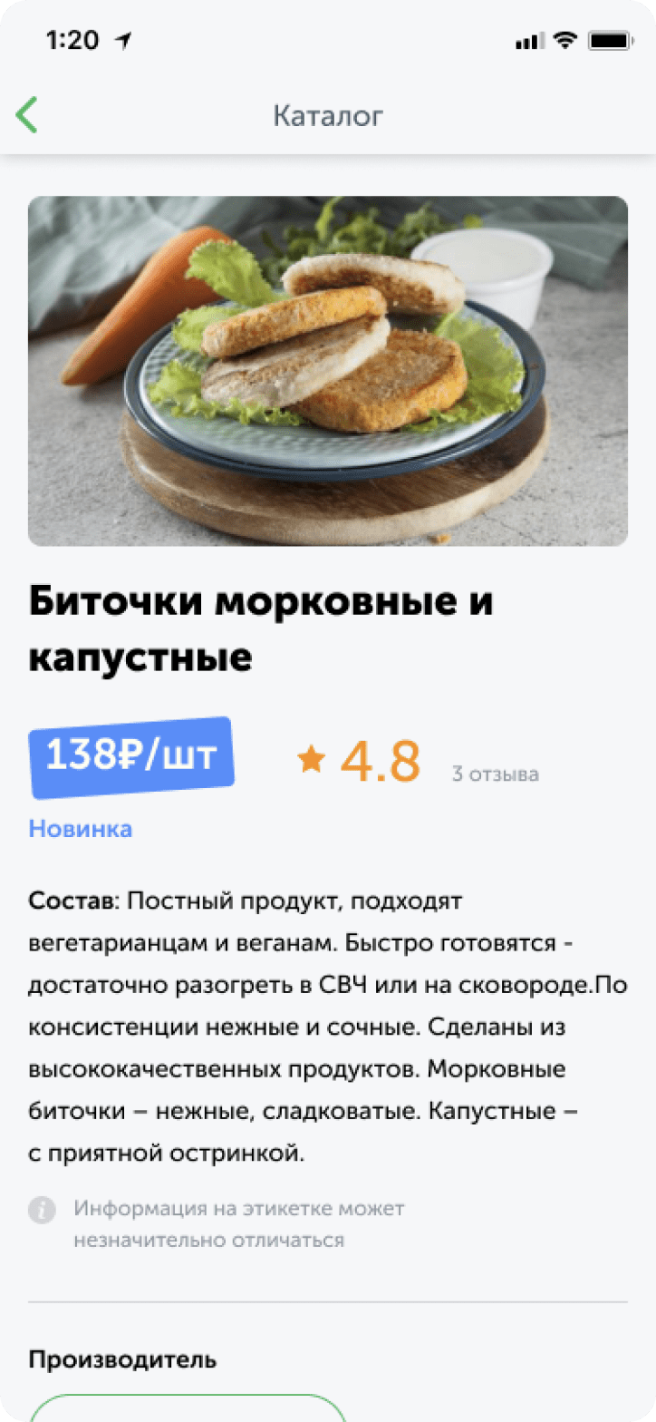 Каталог отражает все товары сети. Есть возможность искать товар по названию с помощью поиска, либо по штрихкоду. В карточке можно посмотреть наличие товара в магазинах, узнать рейтинг на основе оценок покупателей.