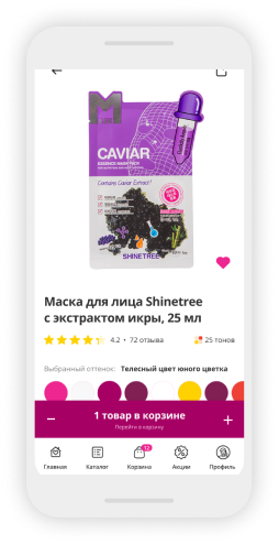 Разработана современная карточка товара с возможностью выбрать конкретный цвет или упаковку, нужную покупателю.